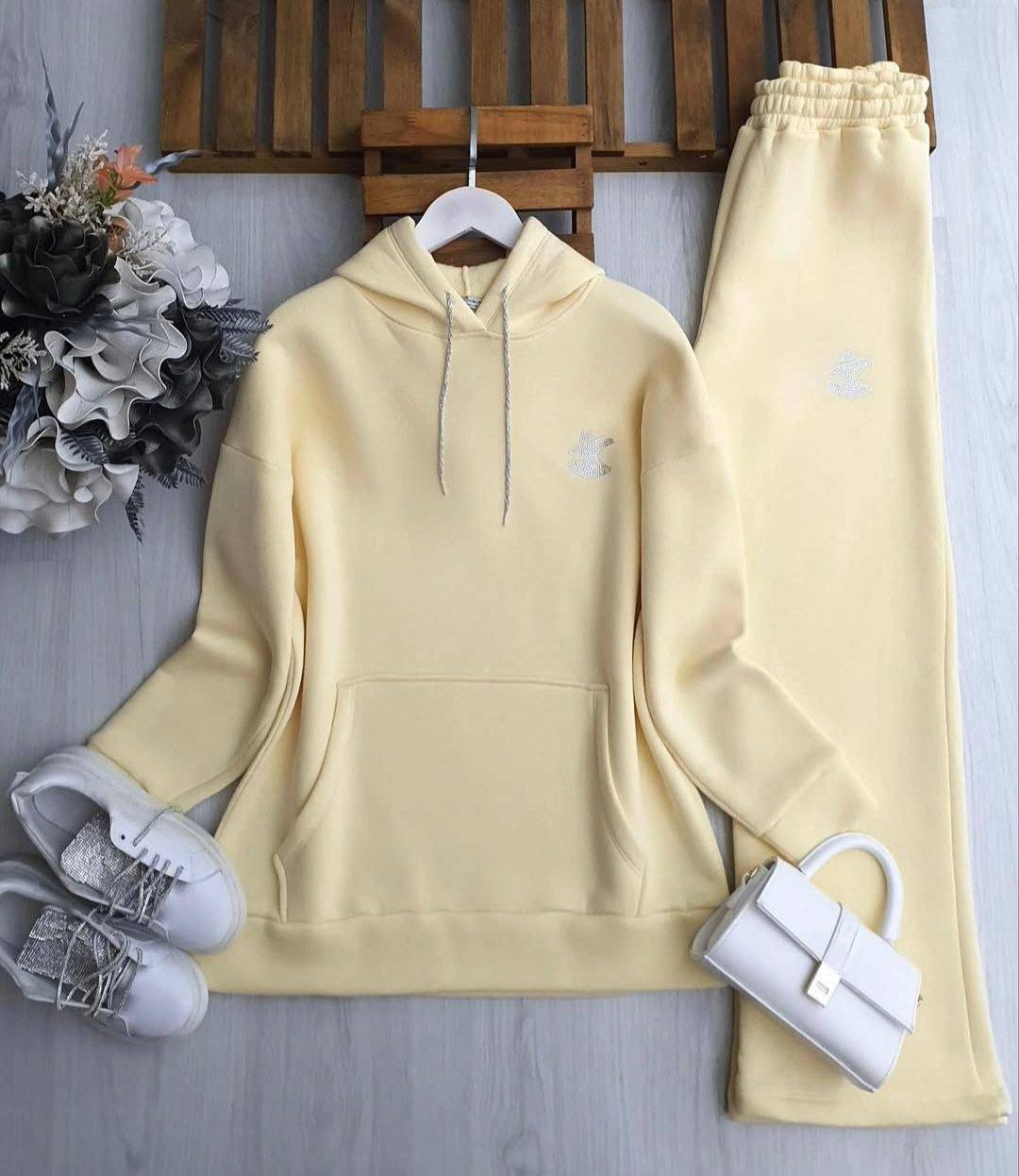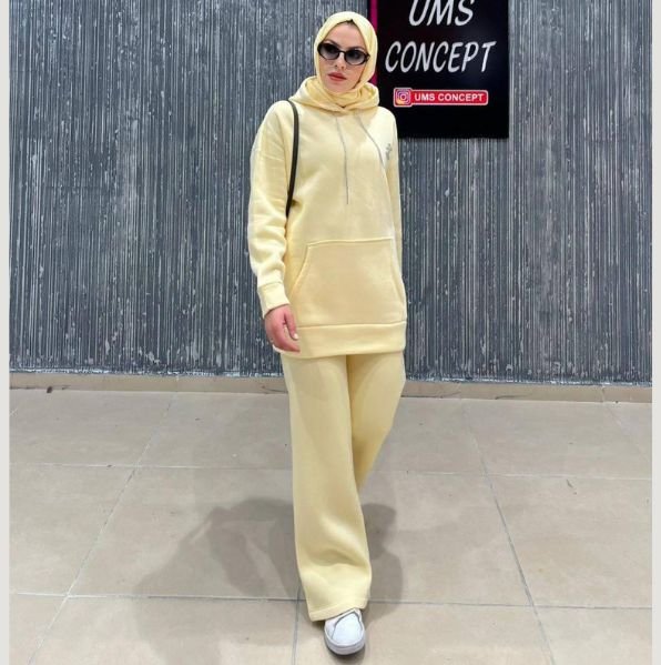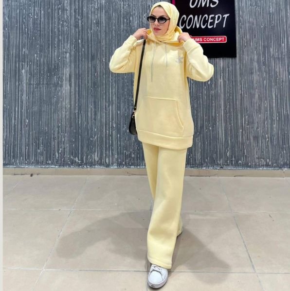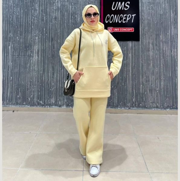 يتميز بتصميم بسيط وعصري مع هودي بجيب أمامي وسروال مطاطي الخصر لراحة يومية. مناسب للإطلالات الكاجوال أو للرياضة والخروج اليومي.