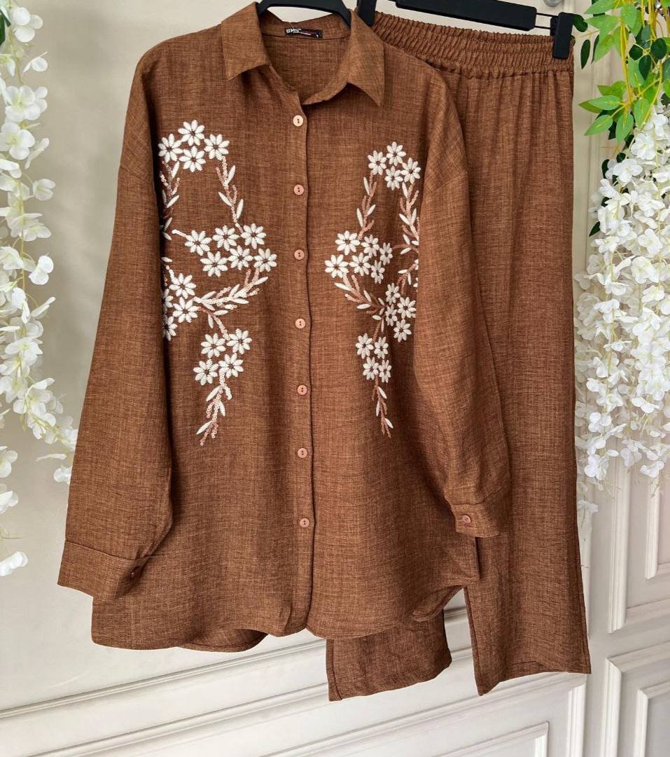 طقم قطعتين قميص وبنطلون اللون العسلي