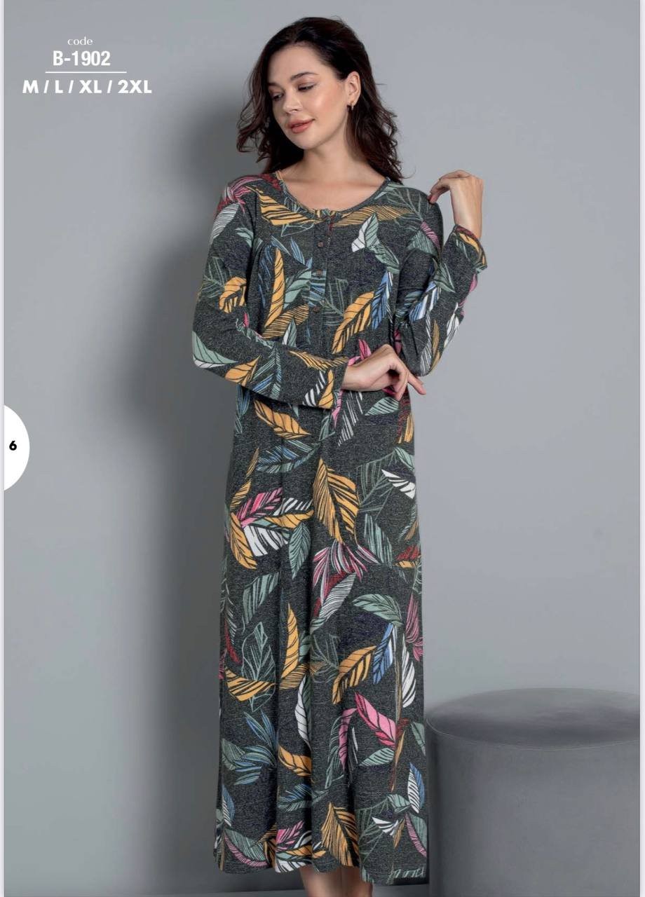 / قميص نوم ستاتي مصوف لون رمادي معرق ورق شجر